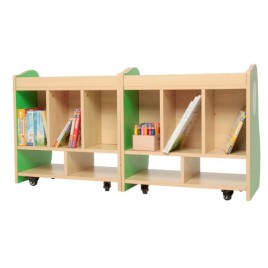 Bac à livres Girafe sur roulettes, équipé de 4 roulettes (dont 2 verrouillables) et deux compartiments.