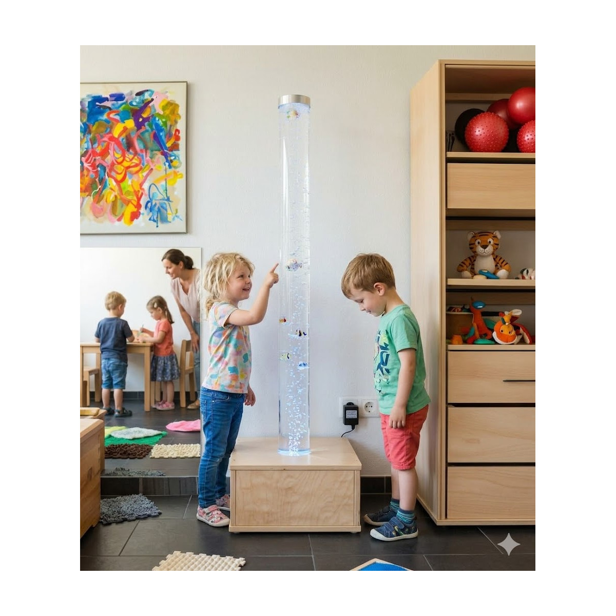 Colonne à bulles sensorielle base en bois adaptée pour une salle sensorielle en maternelle et en garderie, pour le salon et le bureau