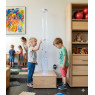 L'intégration de la colonne dans sa base permet de dissimuler élégamment les composants techniques et le câblage, laissant place à un design épuré qui s'harmonise parfaitement avec le mobilier en bois clair typique des écoles maternelles modernes, tout en offrant une surface de contact douce et sécurisante pour les petites mains en exploration.
