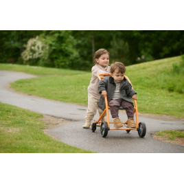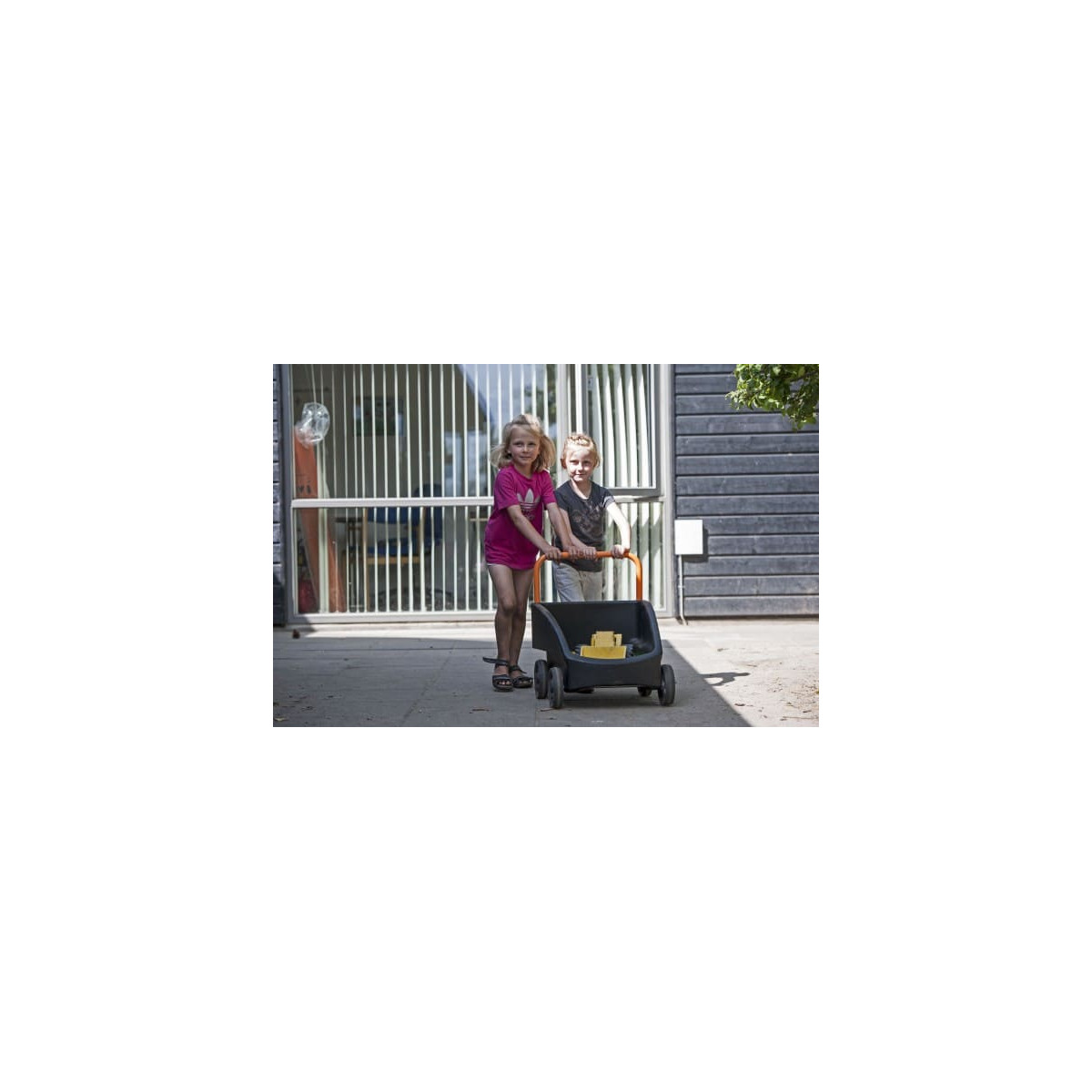 Chariot de jeu actif pour enfants en maternelle, ce chariot à pousser pratique, doté d'un coffre de transport robuste, offre aux enfants de nombreuses possibilités de jeu. Sable, jouets préférés et camarades de jeu peuvent y être transportés. Jouer ensemble stimule l'imagination et les jeux de rôle au sein d'un groupe.