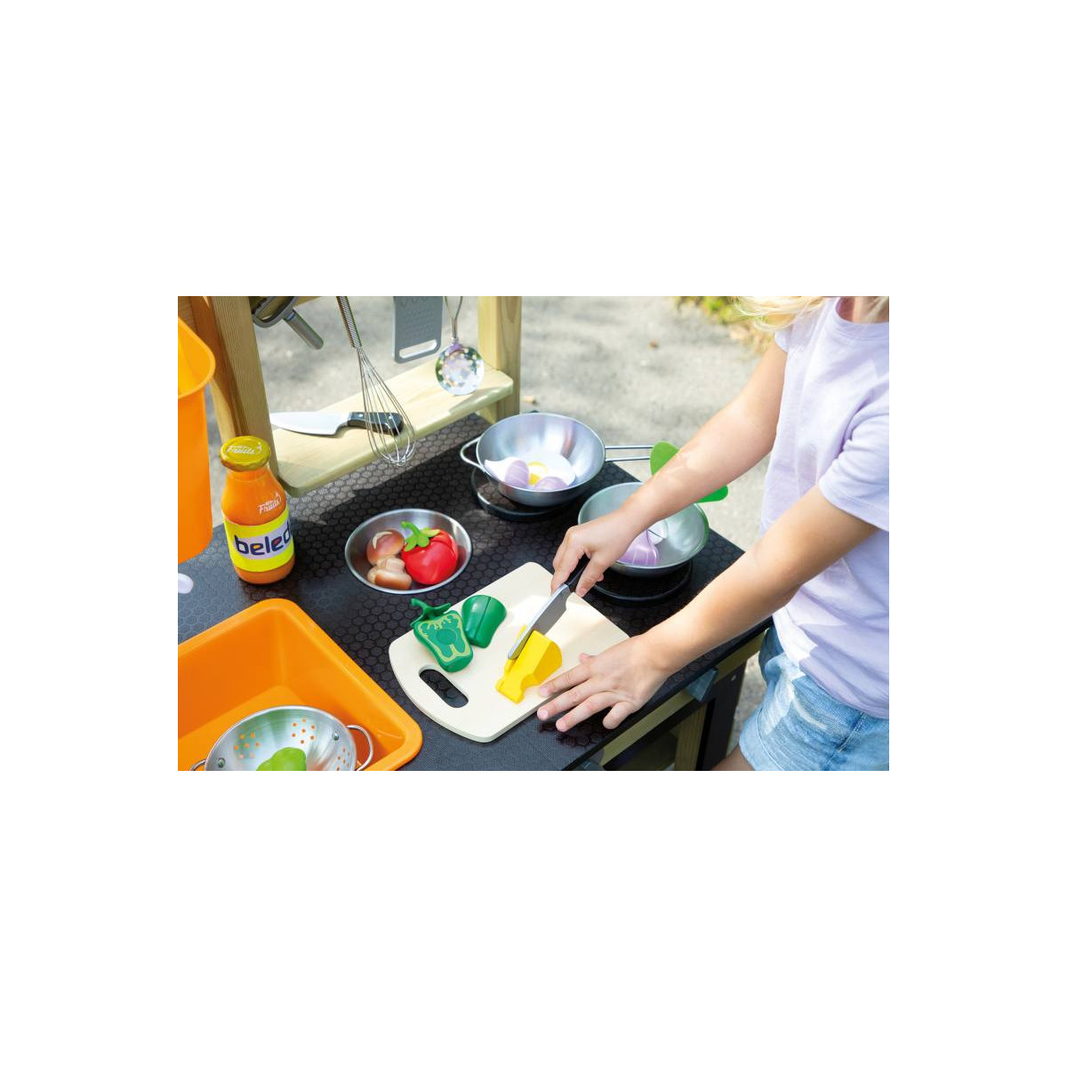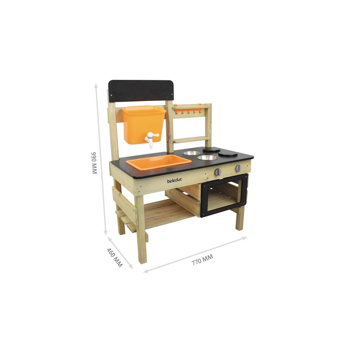 Les étagères et les crochets intégrés offrent des possibilités de rangement pour les ustensiles de cuisine. La cuisine de jeu d'extérieur résiste aux intempéries et est fabriquée en bois solide et en bioplastique.