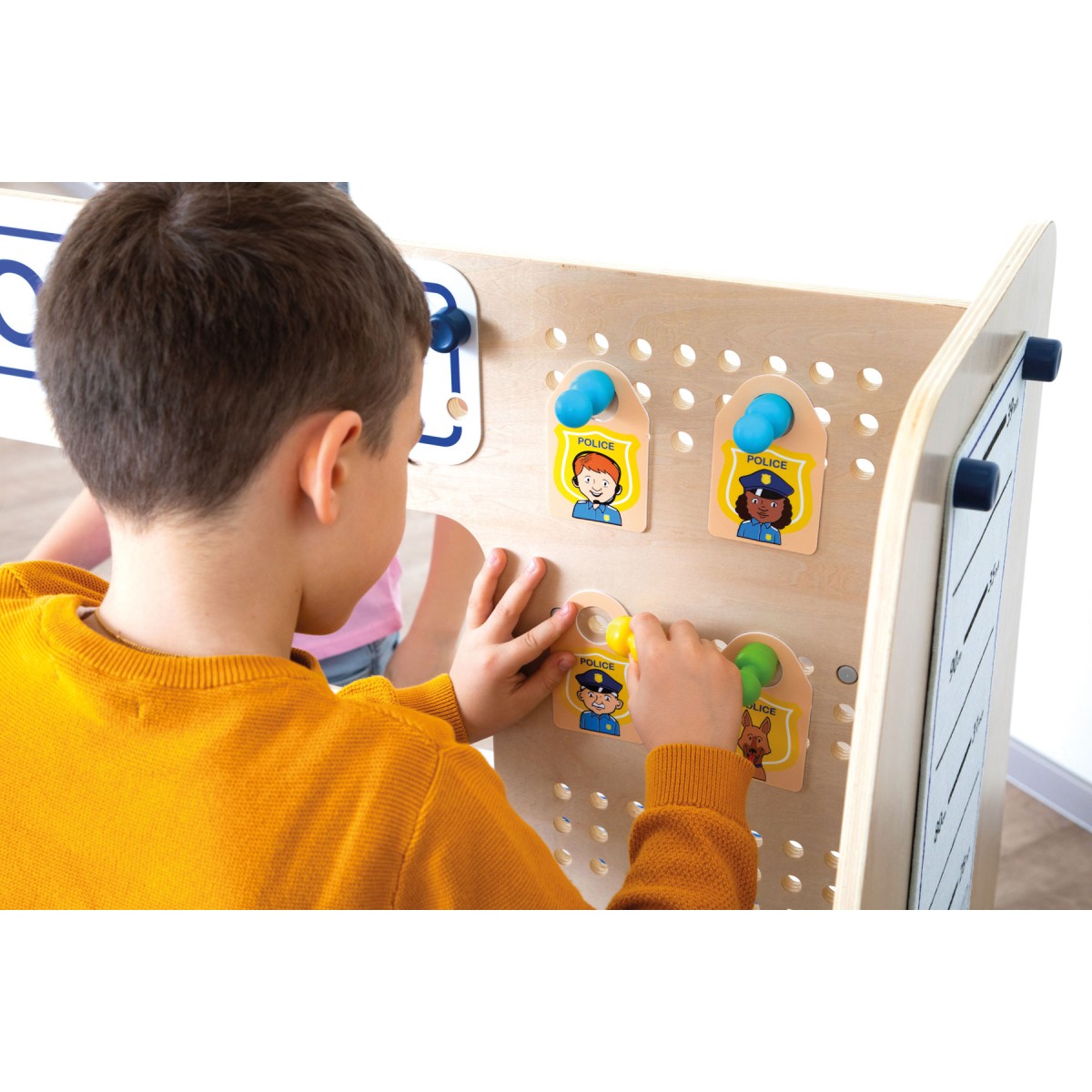 Plongez les enfants dans un univers palpitant où policiers et pompiers unissent leurs forces pour assurer la sécurité et venir en aide aux citoyens. Grâce à cette table de police et de pompiers en bois, ils pourront créer des scénarios réalistes, développer leur imagination et apprendre les notions essentielles du secours et de la protection.