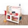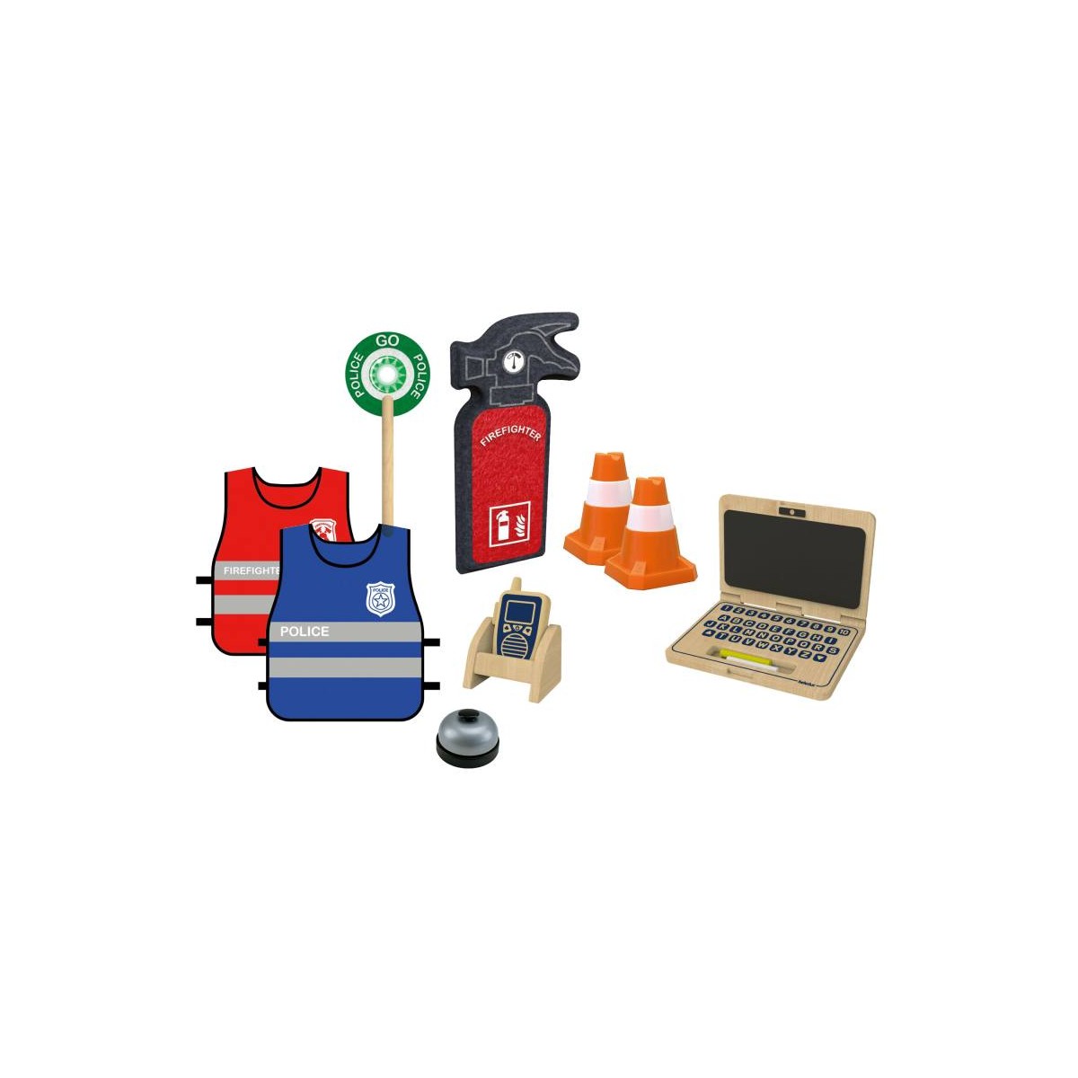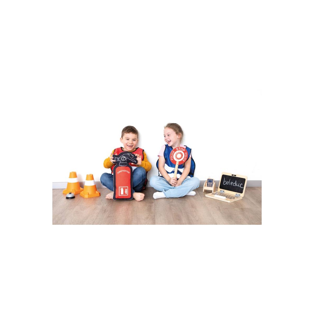 Offert un kit d'activités et de déguisement policier et pompier avec : 2 gilets (rouge et bleu), 1 ordinateur portable et téléphone portable en bois, 2 cônes de délimitation, 1 extincteur (textile), 1 truelle (bois et textile), 1 cloche