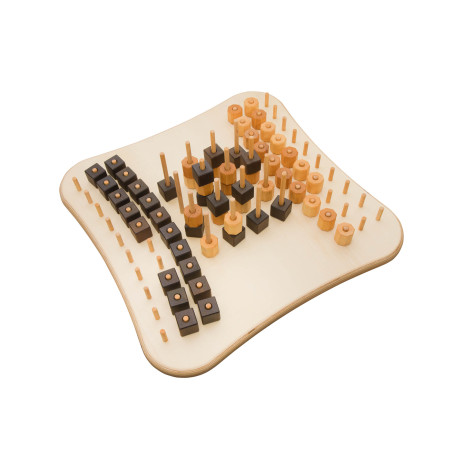 Le jeu comprend 32 dés noirs et 32 prismes de couleur naturelle en bois de hêtre.