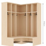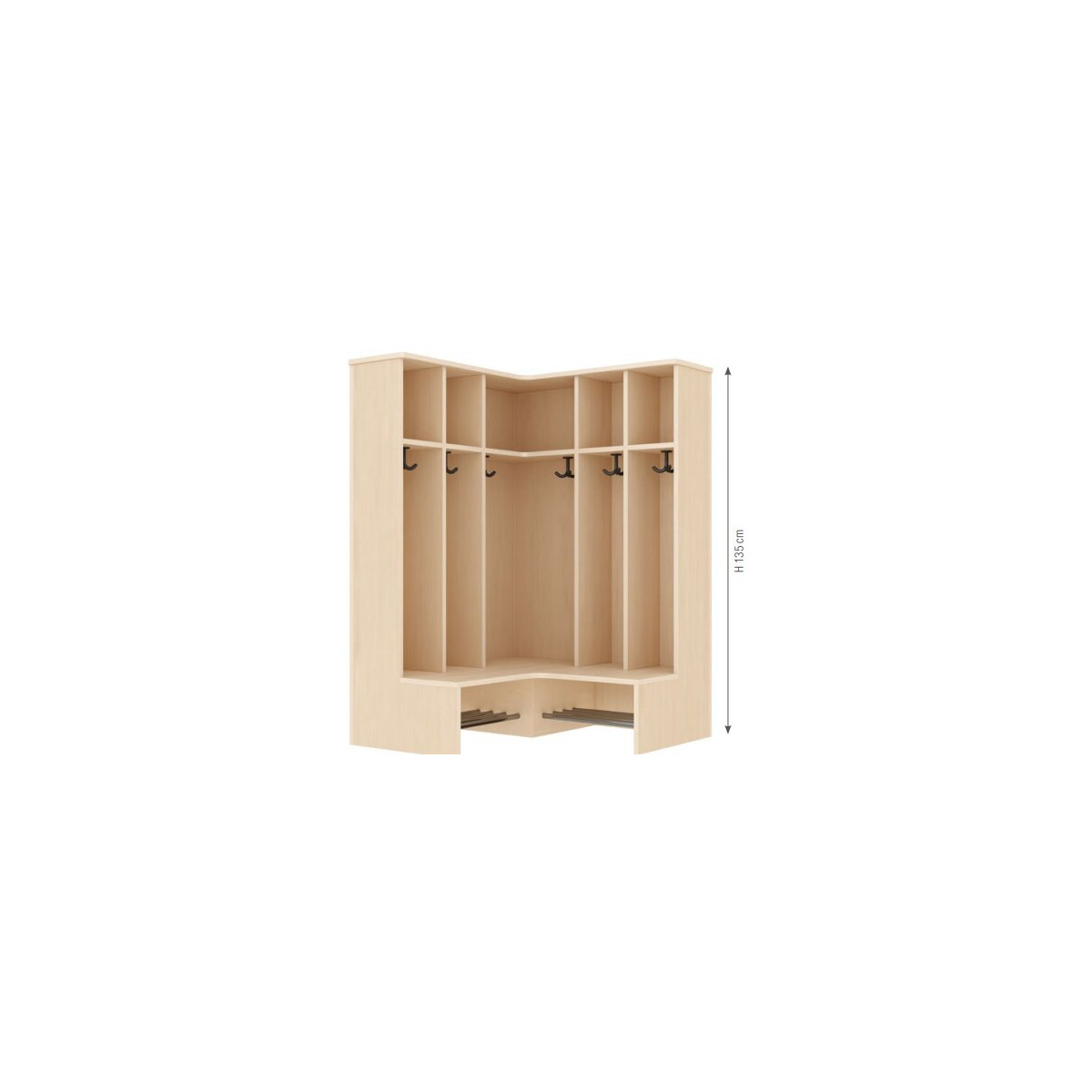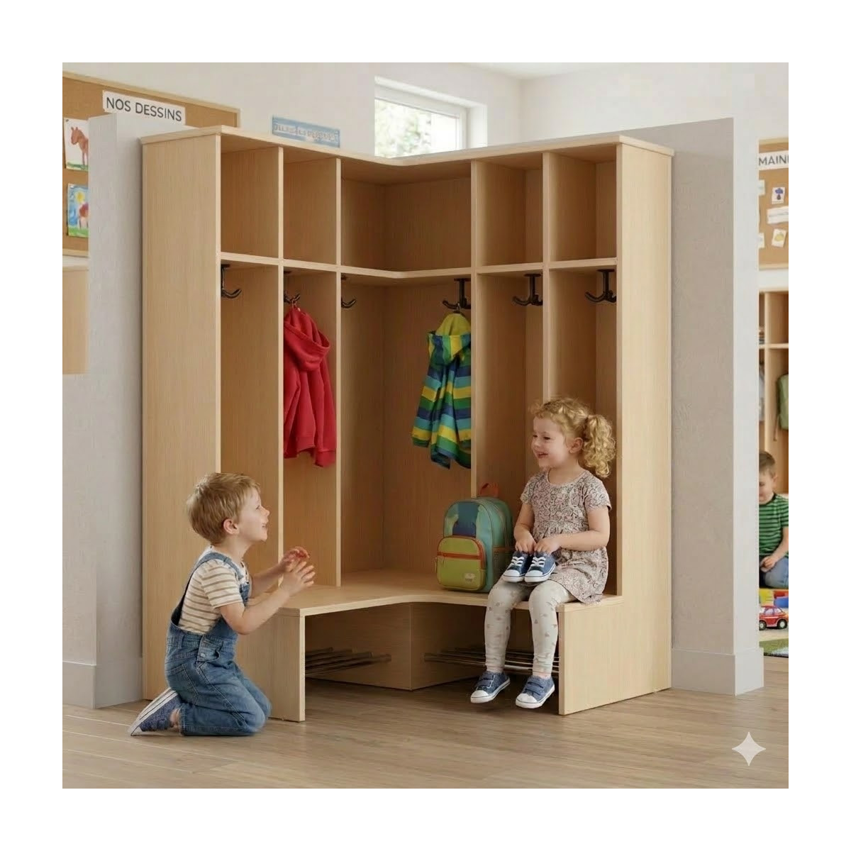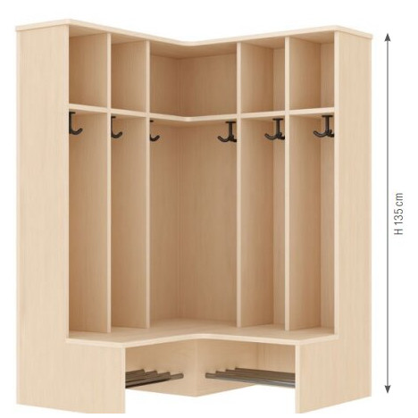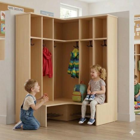 Banc porte-manteaux d'angle 5 casiers et 6 crochets. Ce banc vestiaire pour maternelle est muni de 2 espaces de rangement au bas pour les chaussures, 1 espace de rangement central pour les vêtements et 1 espace en hauteur pour les sacs, chapeaux...