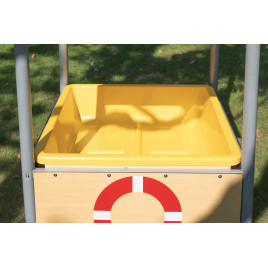 Le cadre est en acier galvanisé et thermolaqué, ce qui le rend particulièrement stable et résistant aux intempéries. Les éléments latéraux sont en stratifié haute pression (HPL) résistant, idéal pour supporter les jeux des enfants. Le grand bac à sable et à eau en polypropylène (PP) résistant est idéal pour les jeux sensoriels et les projets créatifs.