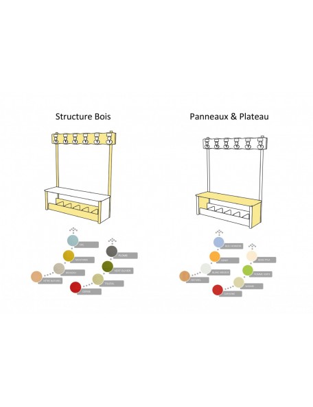 Banc vestiaire scolaire, adapté pour les enfants en crèche, école maternelle, primaire... Ce banc vestiaire scolaire est muni de 6 patères et portes étiquette. 6 casiers en hêtre massif avec fond en contreplaqué d'épaisseur 10 mm. La structure est réalisée en hêtre massif. Piétement assemblé...