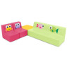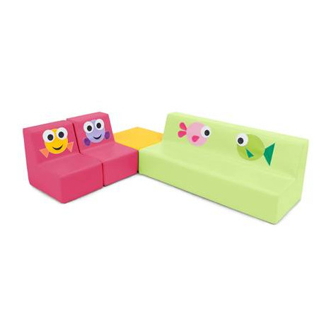 Ensemble canapé, 2 fauteuils, table en mousse, pour enfants en crèche. Cet ensemble est composé de différents éléments avec des motifs poissons variés et cousus sur chaque élément.