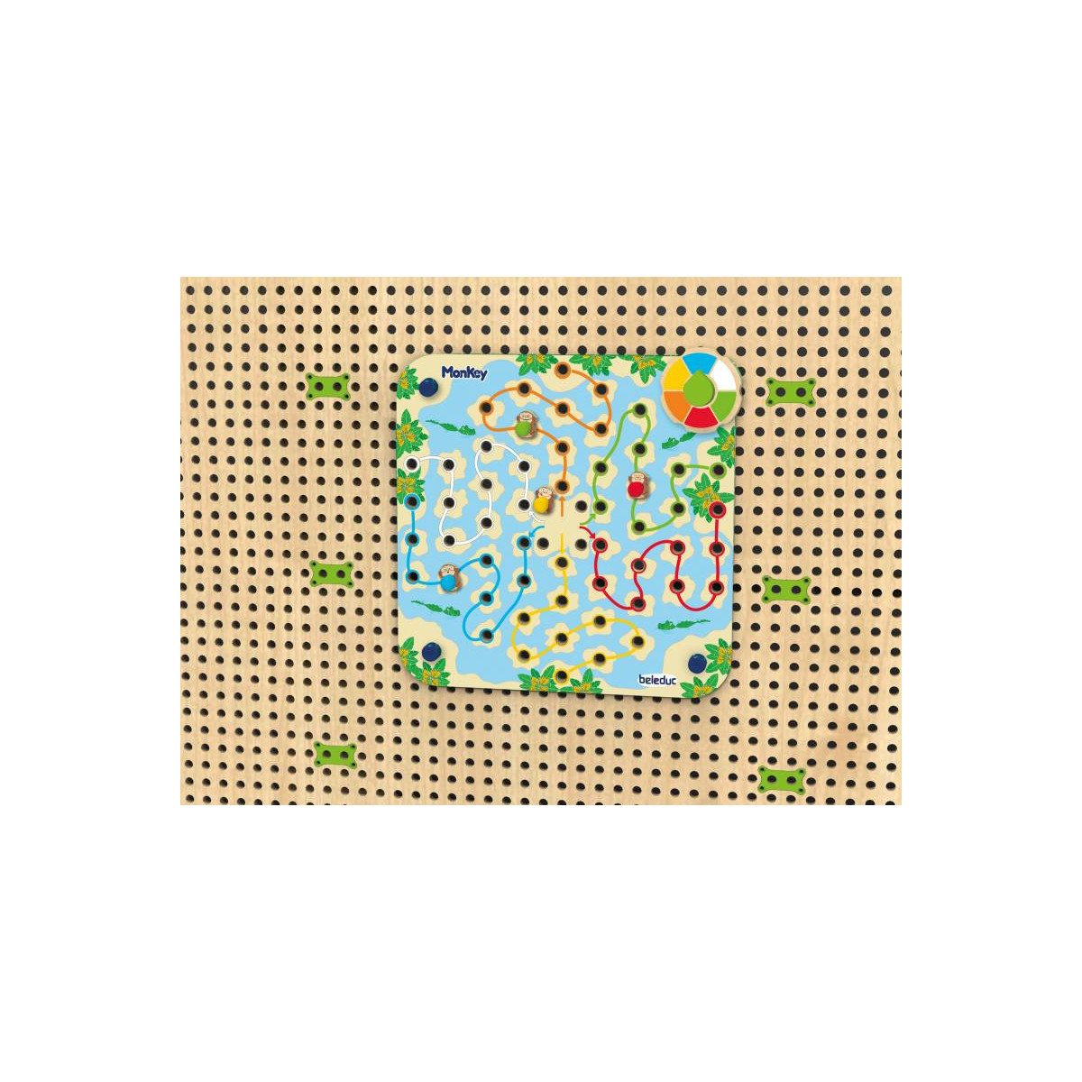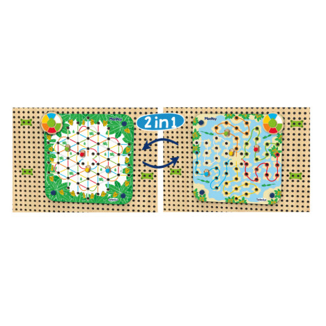 Le jeu des singes 2 en 1 contient : 1 x feuille avec deux jeux différents, 3 x plugs de fixation, 4 x plugs en bois avec motif de singe, 1 x plateau tournant en bois