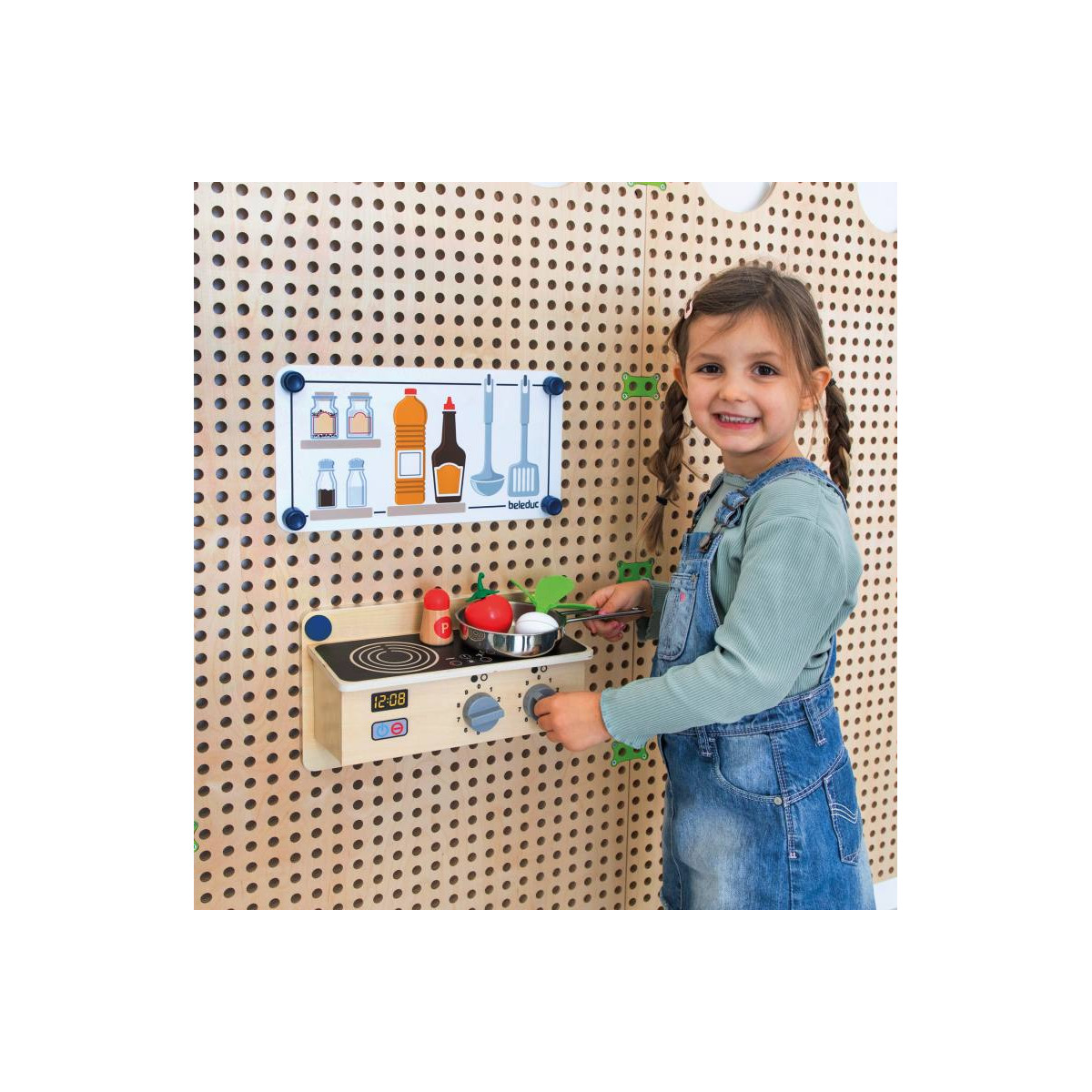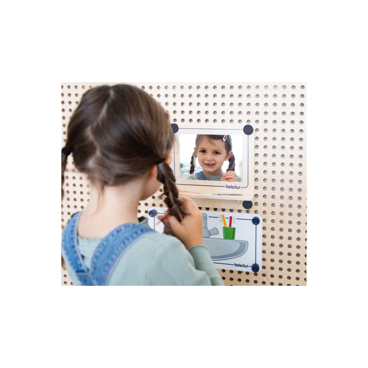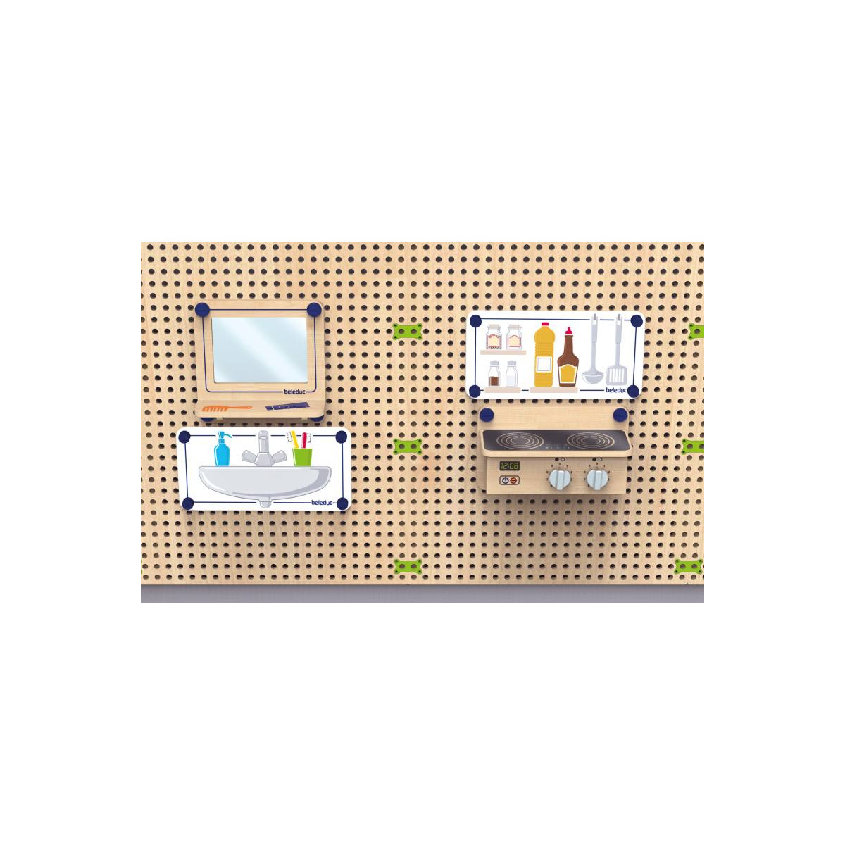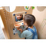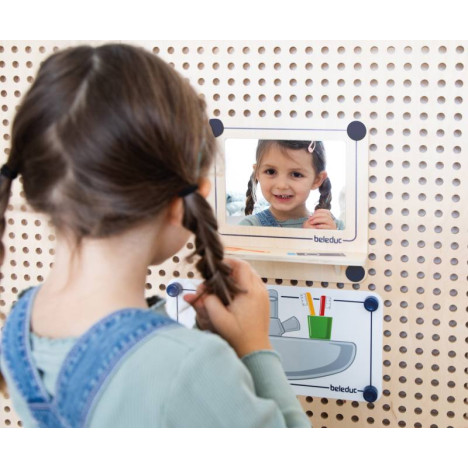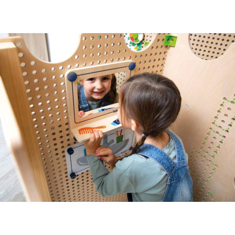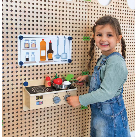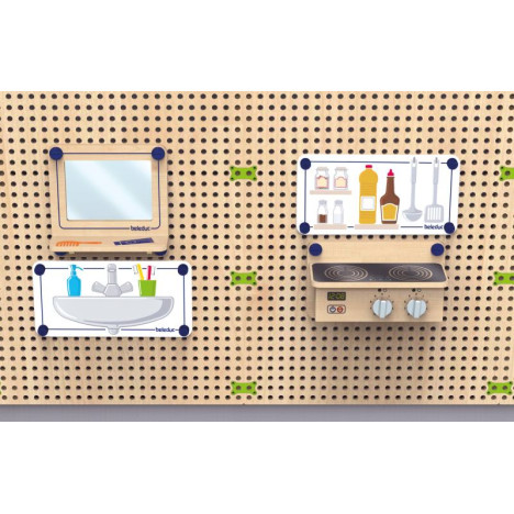 Le kit jeu de rôle Cuisine & Salle de bain inclus : 1 x miroir dans un cadre en bois avec console, 1 x film PS imprimé double face "salle de bain, 1 x console de cuisine en bois avec 2 boutons rotatifs, 1 x film PS imprimé double face "cuisine, 8 x plugs de fixation spéciaux, 8 x plugs de fixation