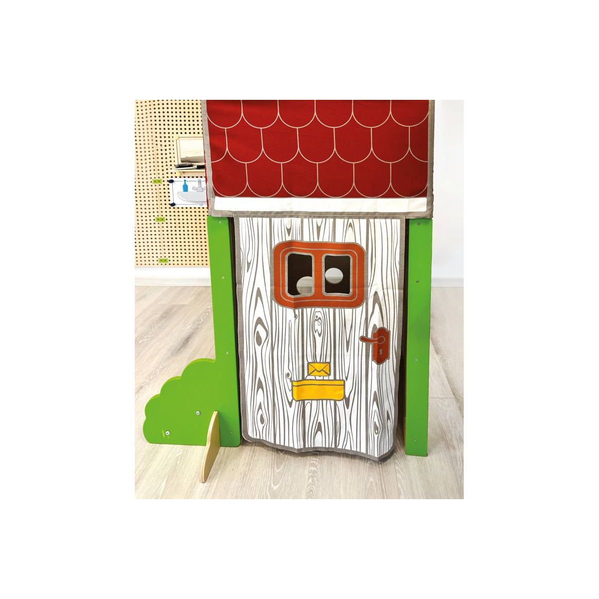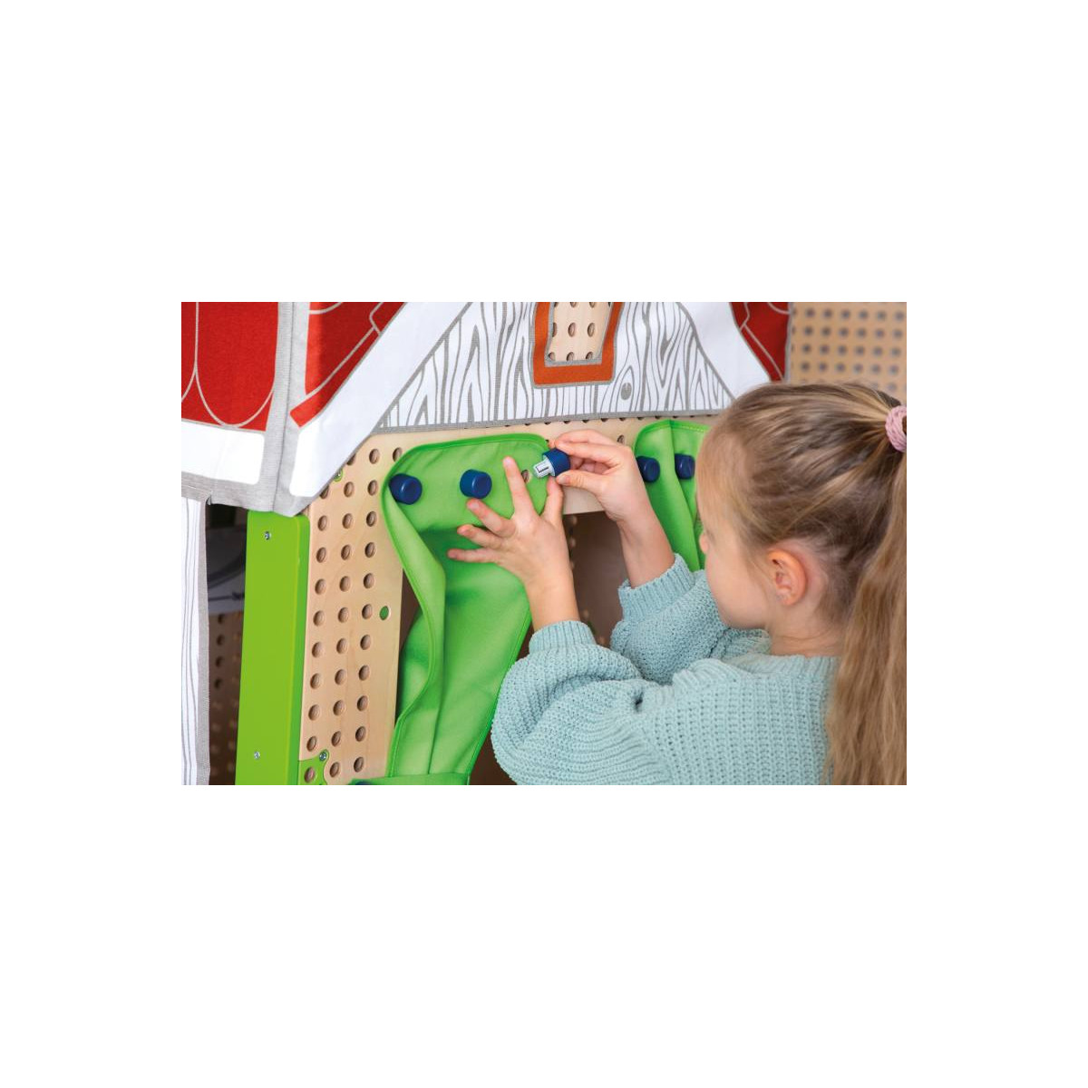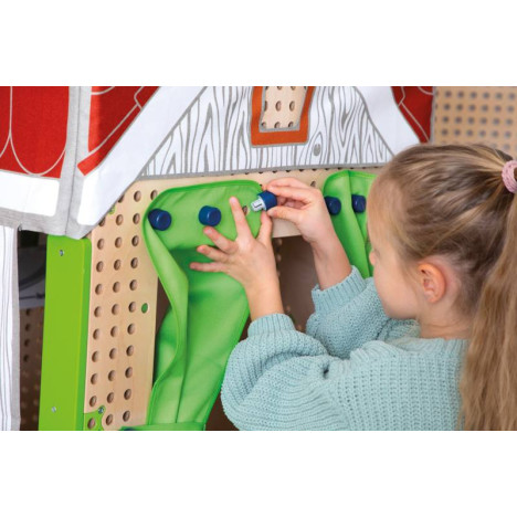 - Le jeu de rôle toiture textile PLUG IT : Entrez ! Transformez la cabane de jeux avec son toit en tissu en un nid douillet. Les rideaux peuvent être fixés à l'aide de chevilles, créant ainsi un théâtre de marionnettes. Avec le toit en textile, la maison d'activités PLUG it devient vraiment confortable.