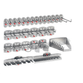 Contenu : panneaux avec dessus : 1 grand compartiment (49,5 x 36 cm) et deux petits compartiments (24 x 36 cm), un côté avec une étagère (101 x 25 cm), l'autre côté avec une paroi à outils rouge (100 x 45 cm).