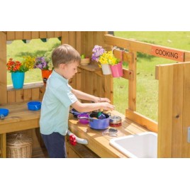 Cet ensemble comprend un robinet (déco), évier, 4 plaques de cuisson munis de 2 boutons de réglages et cloche. Par ailleurs, la cuisine extérieure pour enfants propose beaucoup de rangement pour toutes sortes d’ustensiles de cuisine