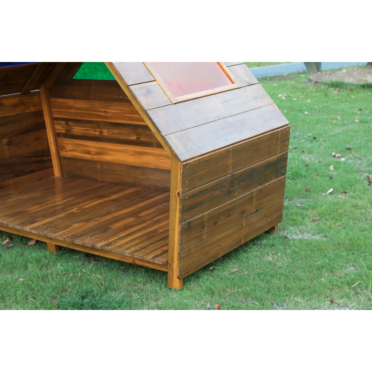 Fabriquée en pin imprégné sous pression et traitée avec un vernis huile/cire, elle offre une protection durable contre les intempéries. Ses fenêtres incassables en polycarbonate coloré garantissent sécurité et agrémentent le jeu.
