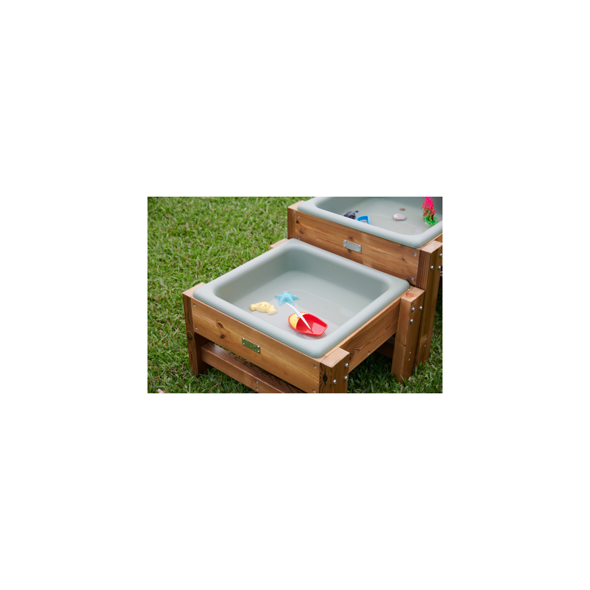 Ce grand parcours d'eau extérieur se compose de trois bacs de même taille, placés à différentes hauteurs pour former un escalier. Peu profonds, chaque bac peut contenir une quantité idéale de sable, d'eau ou d'autres substances à explorer.