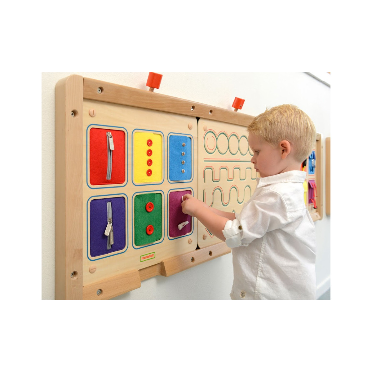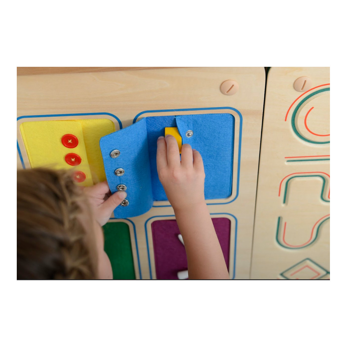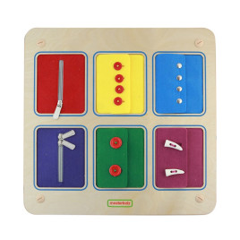 Apprends à ouvrir boutons, fermetures éclair et plus encore ! Ce panneau mural boutons et fermetures Masterkitz d'éveil propose une grande variété de fermetures : petits et grands boutons, fermetures éclair simples et doubles, et boutons-pression invitent les enfants à les ouvrir et à les fermer.