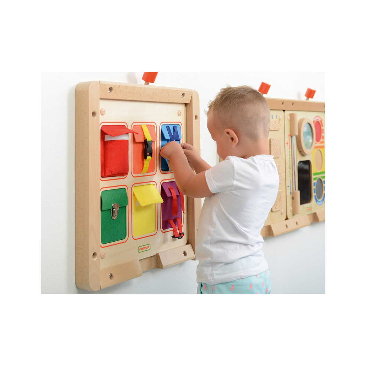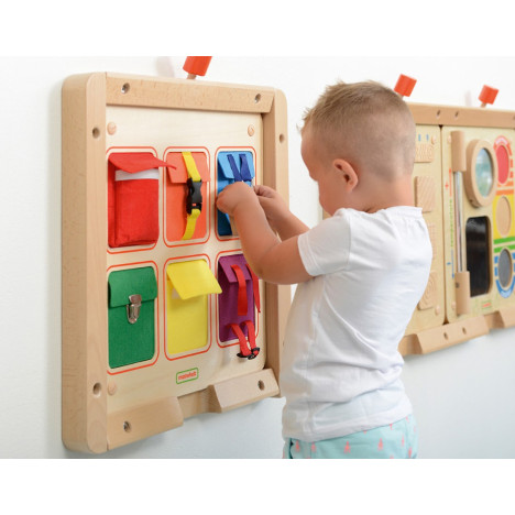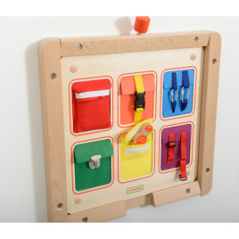 Ce panneau d'éveil mural les fermetures Masterkitz invite les enfants à découvrir et à s'exercer à ouvrir et fermer différents types de fermetures.