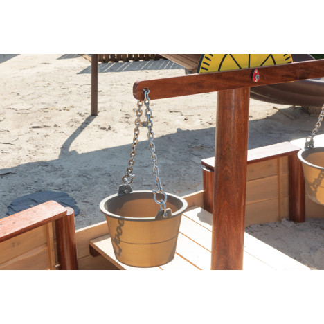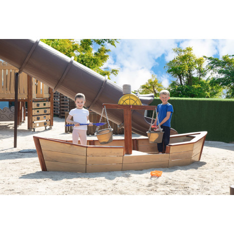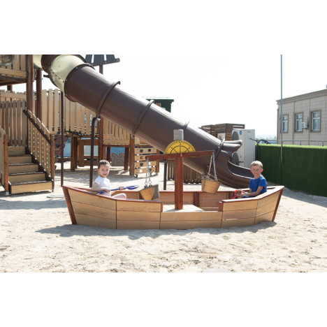 La structure de jeu extérieure sur sable le bateau est une aventure maritime pour votre école maternelle. La structure de jeu de sable « Bateau » est équipée d'une balance et de deux seaux fixés en permanence, pour encore plus de plaisir.
