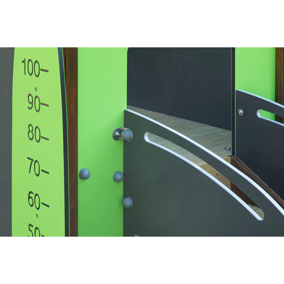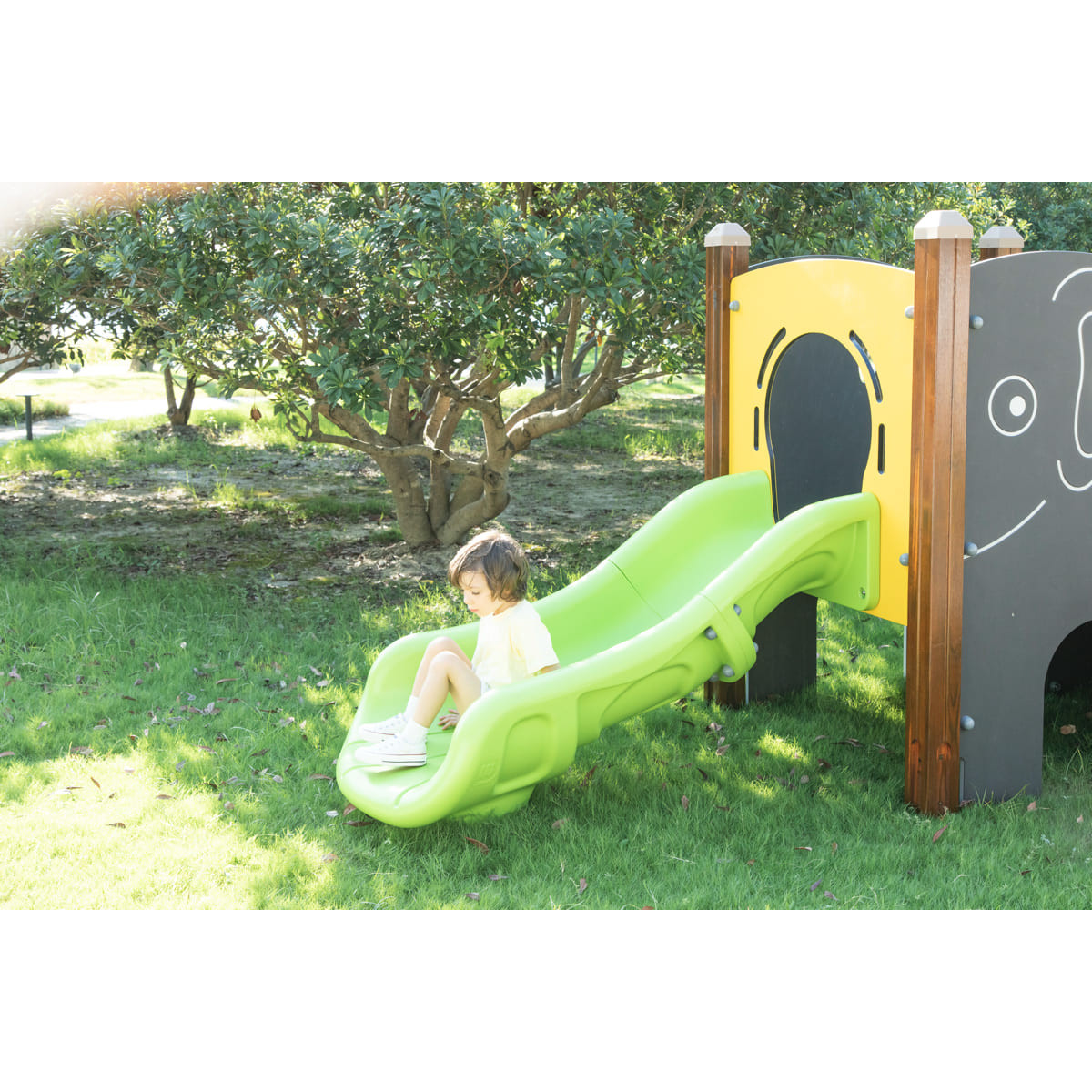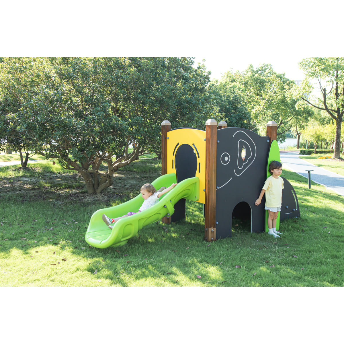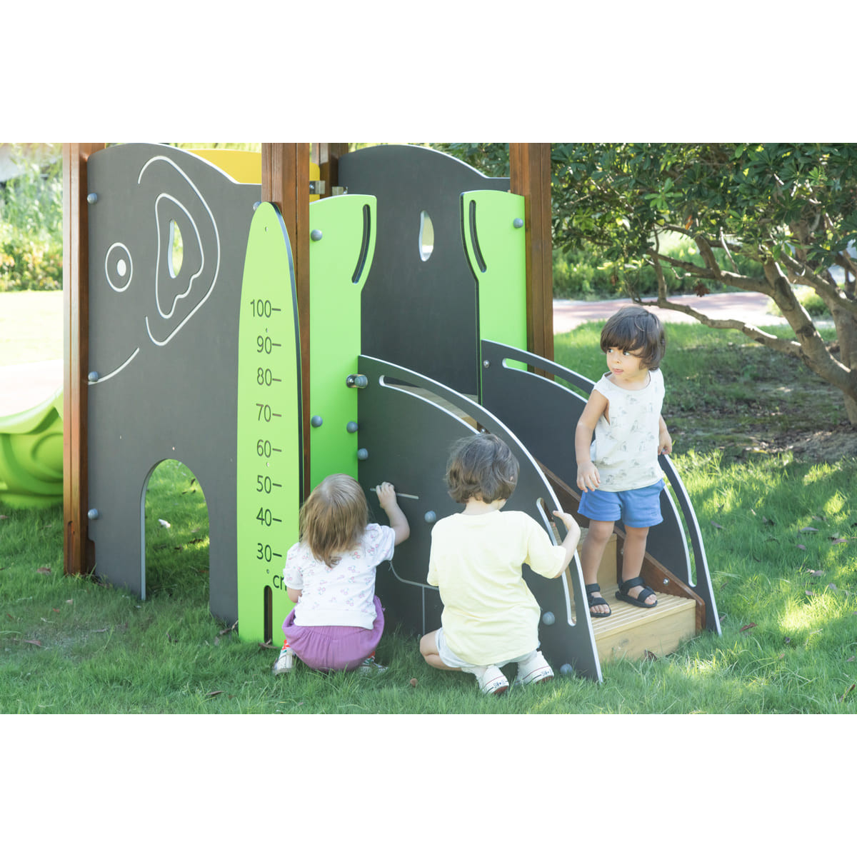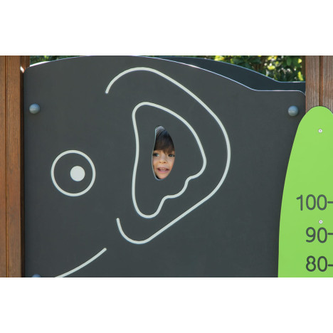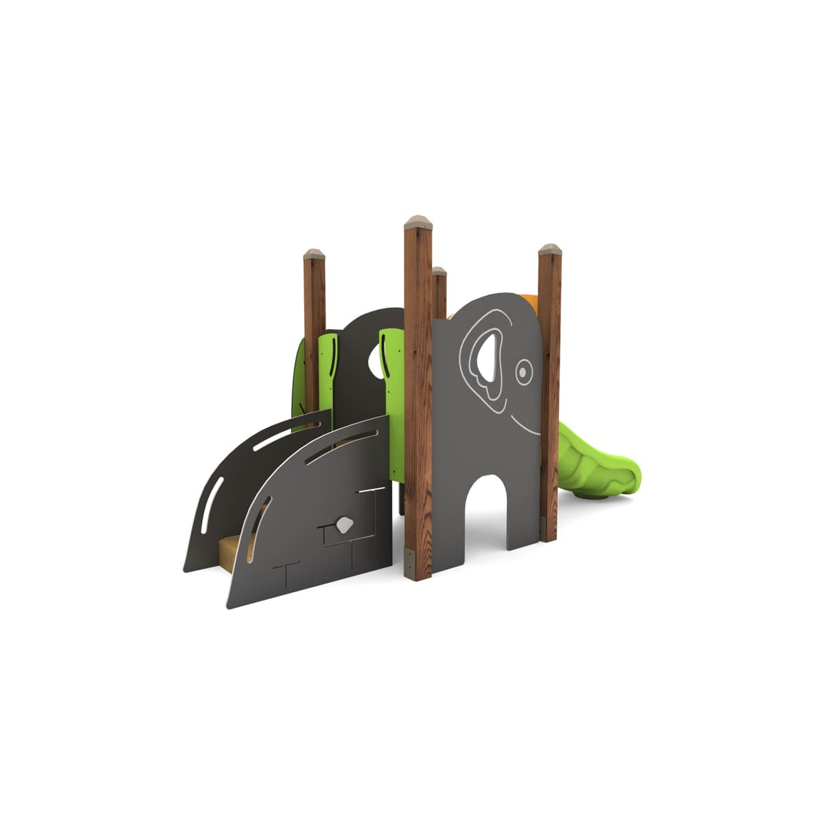 La structure de jeu « Éléphant » offre une variété d'éléments stimulants qui favorisent le développement des enfants en plein air. Le toboggan intégré procure un plaisir inoubliable tout en développant la motricité. Le toboggan à barreaux permet de suivre la croissance des enfants de manière ludique. Le plateau stimule l'imagination et contribue au développement de la motricité fine des enfants. C'est ici qu'ils peuvent résoudre des énigmes et renforcer leurs capacités cognitives.