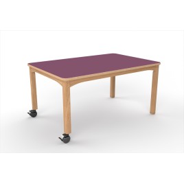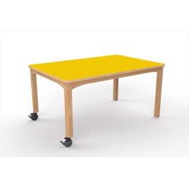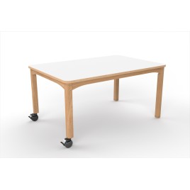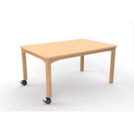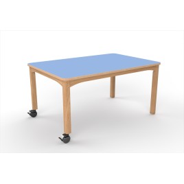 Structure hêtre massif. Plateau en panneau de particules stratifié ép.20 mm. Chant ABS hêtre avec rayonnage 2 mm. Patins plastiques.
