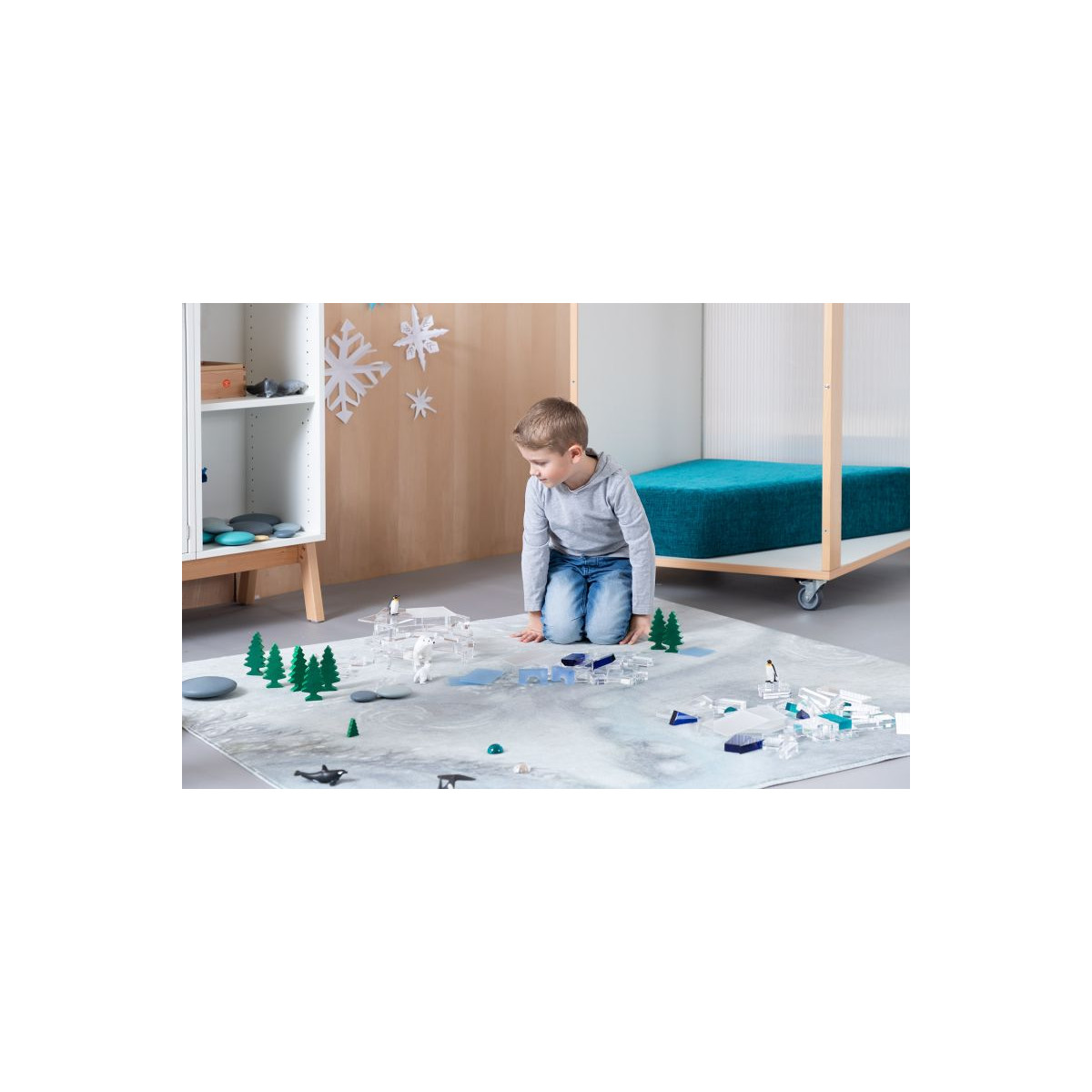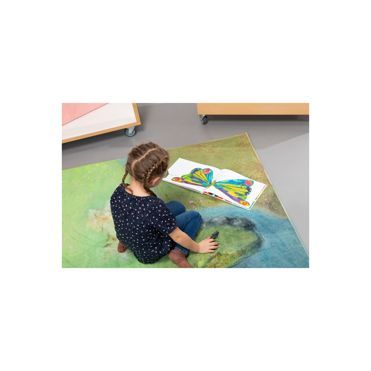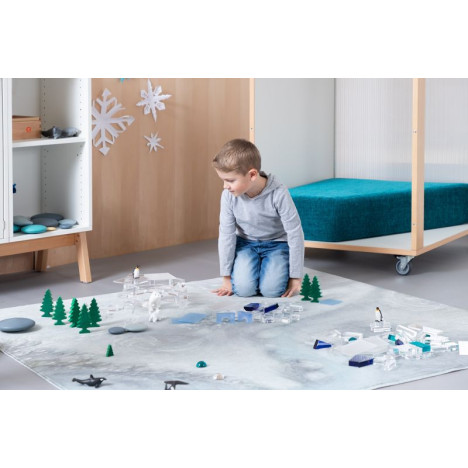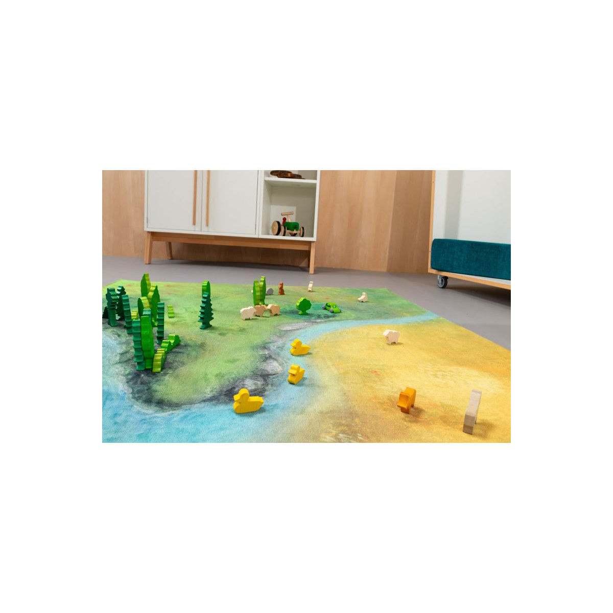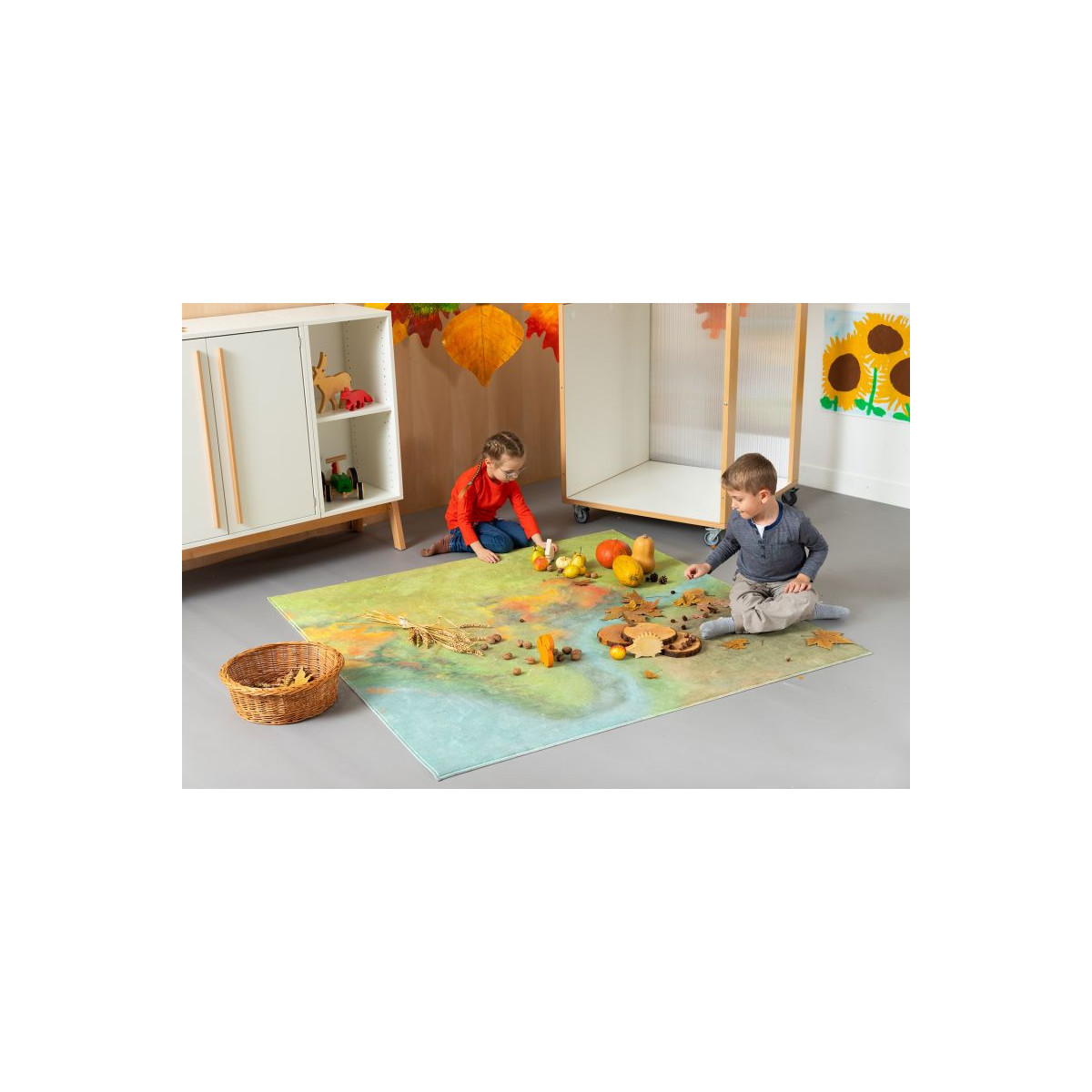 Ce que les enfants observent dans la nature se retrouve ainsi, au fil des saisons, dans les salles de classe grâce à ce tapis. Il sert à la fois d’aire de jeu, de support pour exposer des éléments naturels collectés et d’élément décoratif.