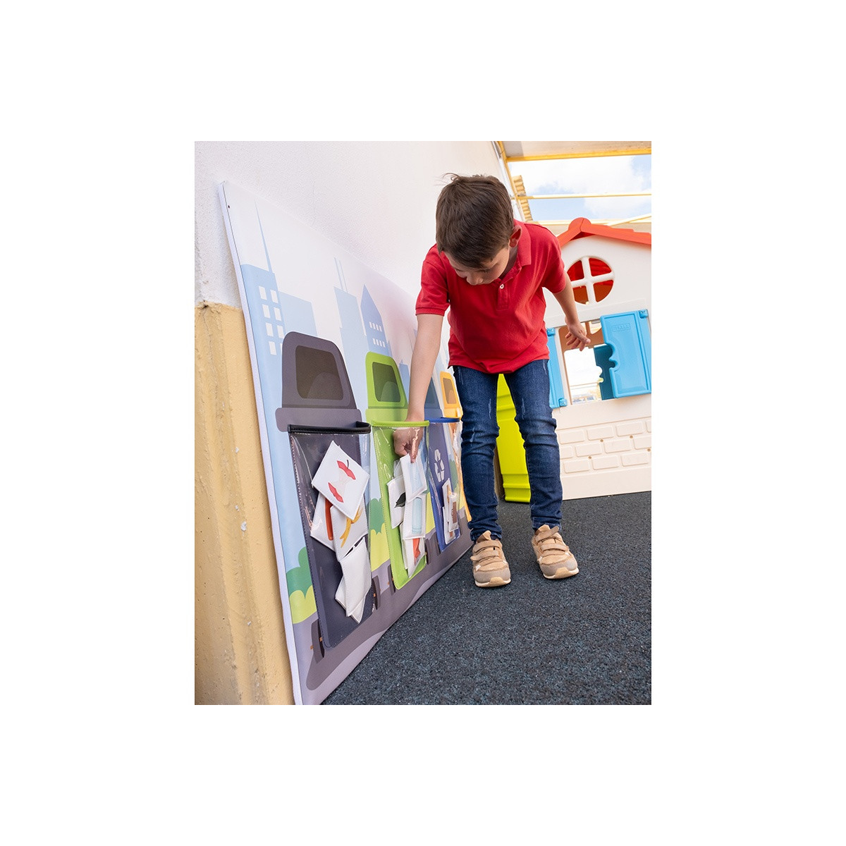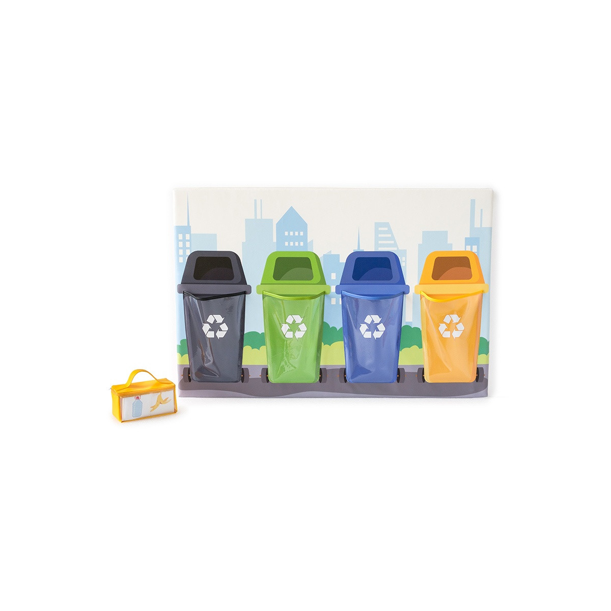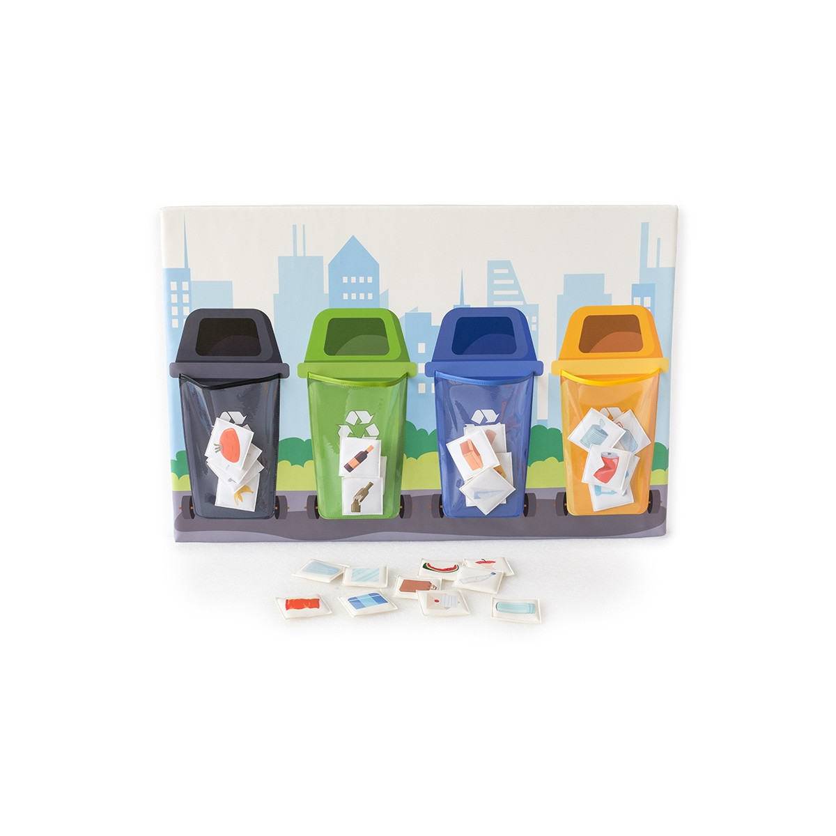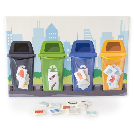 Le jeu est composé d’un panneau mural avec 4 images de poubelle de recyclage aux couleurs différentes (noir, vert, bleu, jaune). Chaque poubelle contient des sacs dans lesquels vous pouvez ranger 27 images d’objets. Le but est de ranger l'image au bon endroit, selon le thème des images présentées.