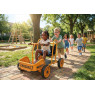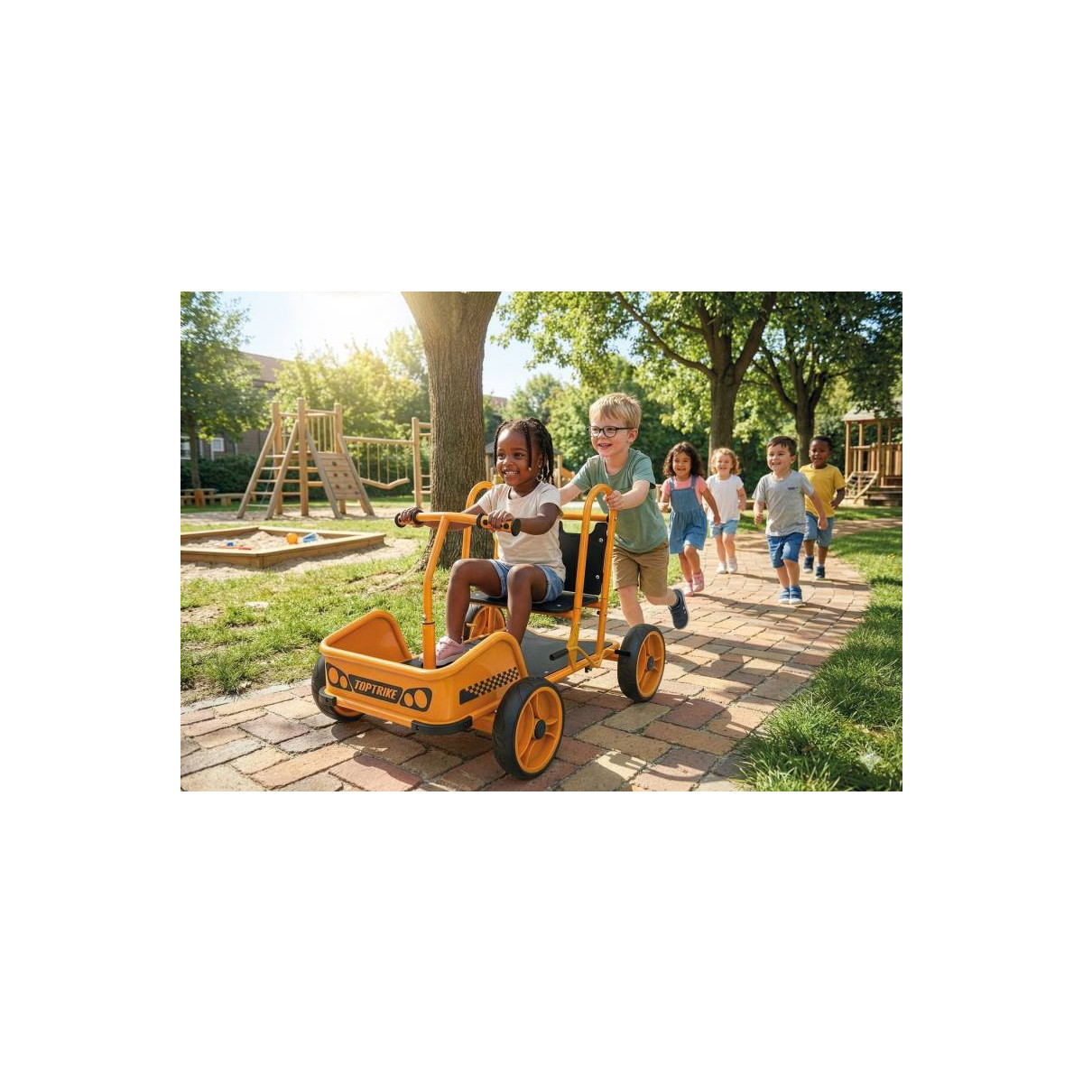 La robuste voiturette des amis Top Trike" garantit le plaisir de jouer ensemble : Plusieurs enfants peuvent s'y amuser., un enfant est assis à l'avant et dirige, un autre pousse.