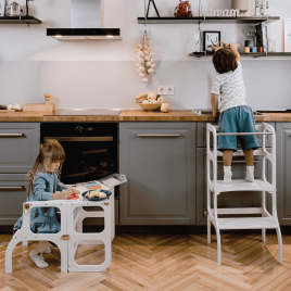 Chaque enfant est curieux par rapport à son environnement! Que fait maman dans la cuisine ? Papa a peut-être besoin d'aide à table ? La tour convertible Montessoti est le meuble parfait pour votre petit ange curieux s'il veut vous aider dans la cuisine ou atteindre un endroit plus haut. La tour d'observation permet à l'enfant d'atteindre en toute sécurité les surfaces de la cuisine et l'évier pour se laver les mains et les fruits. Vous pouvez également l'impliquer dans la cuisine, comme mélanger la pâte et couper les fruits rouges.