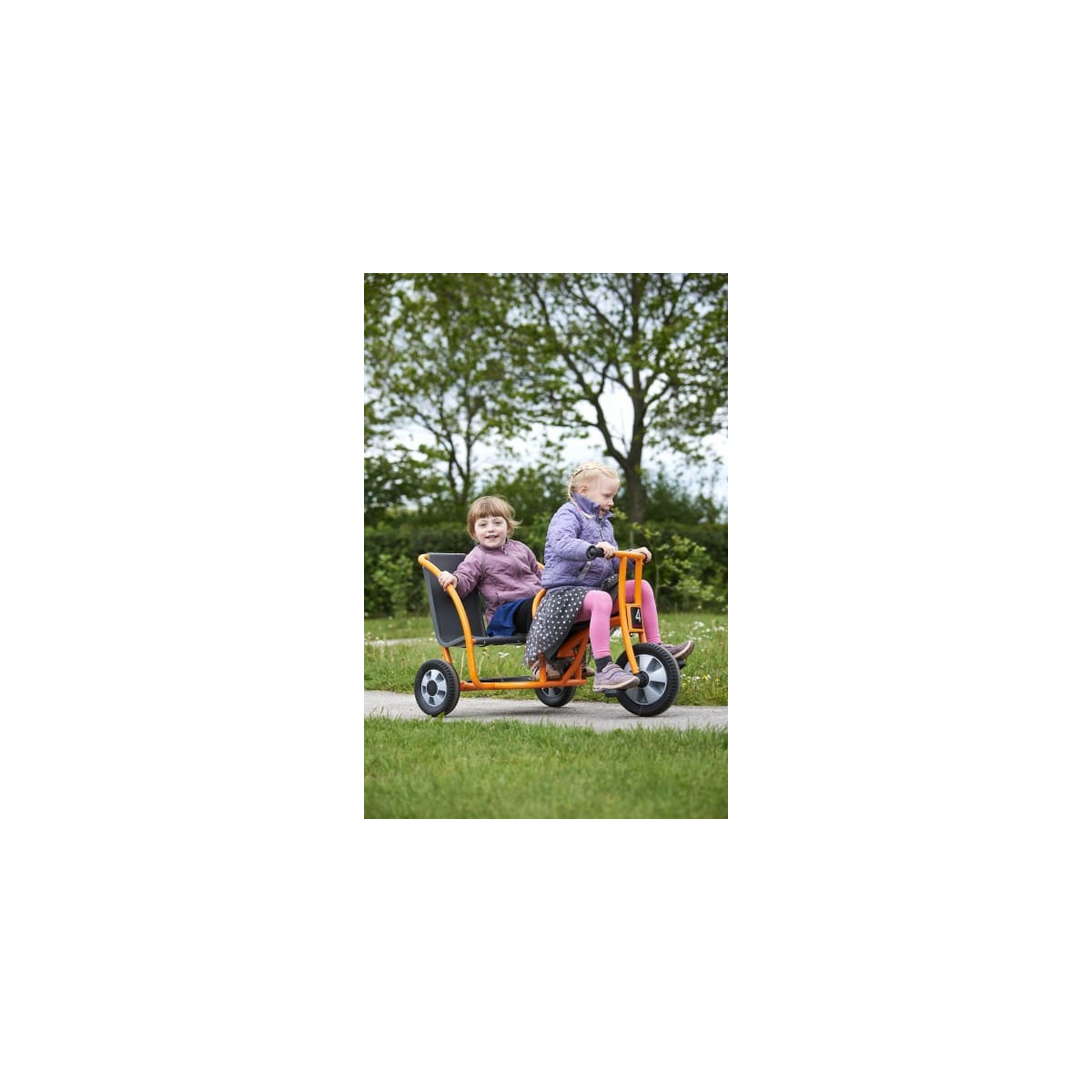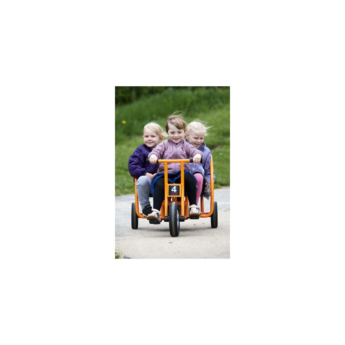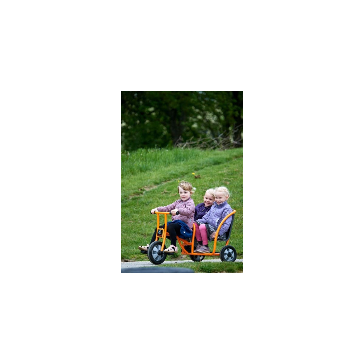 Un tricycle taxi 3 places Aktiv au design soigné pour trois enfants – idéal pour de nombreux jeux d'apprentissage social et de rôle. Par exemple, emmener leur meilleur ami ou jouer au chauffeur de taxi et écouter la conversation à l'arrière.